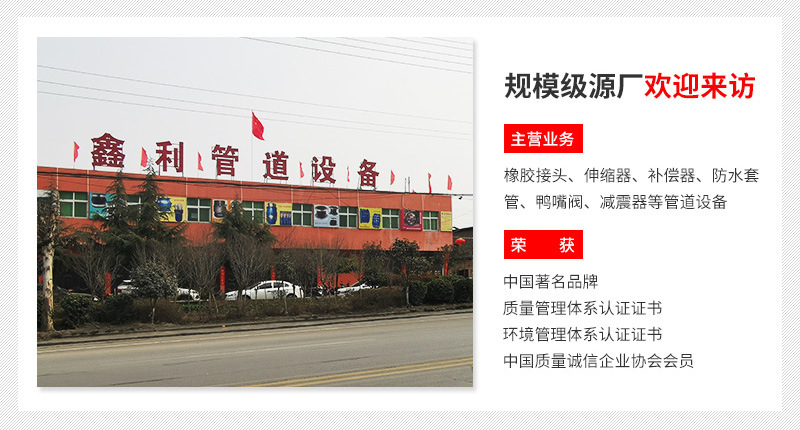 鑫利管道設(shè)備有限公司是生產(chǎn)各種橡膠接頭的生產(chǎn)廠家,。主要產(chǎn)品有橡膠管接頭橡膠軟接頭、可曲撓橡膠接頭單球體橡膠接頭、雙球體橡膠接頭異徑橡膠接頭、卡箍橡膠接頭、絲扣橡膠接頭90度橡膠接頭、異徑橡膠接頭、多球體橡膠接頭等。嚴(yán)格按照標(biāo)準(zhǔn)設(shè)計(jì)生產(chǎn),特殊規(guī)格型號(hào)可按用戶需要和要求訂做。設(shè)計(jì)獨(dú)特,結(jié)構(gòu)新穎合理,性能可靠,給工程施工、維修帶來極大的方便和效益。 我公司技術(shù)力量雄厚,設(shè)備精良,工藝好,有一批從事多年機(jī)械設(shè)計(jì)制造經(jīng)驗(yàn)豐富的高級(jí)工程技術(shù)人員和專業(yè)技術(shù)工人。生產(chǎn)的產(chǎn)品廣泛用于供水、排水、電力、冶金、城建、石油、化工環(huán)保各大中型企業(yè)等領(lǐng)域的供排水事業(yè)的建設(shè)中,“鑫利人”竭誠(chéng)歡迎各界朋友、新老用戶前來我們公司實(shí)地考察指導(dǎo)、精誠(chéng)合作、共同發(fā)展、同創(chuàng)大業(yè)。熱線: